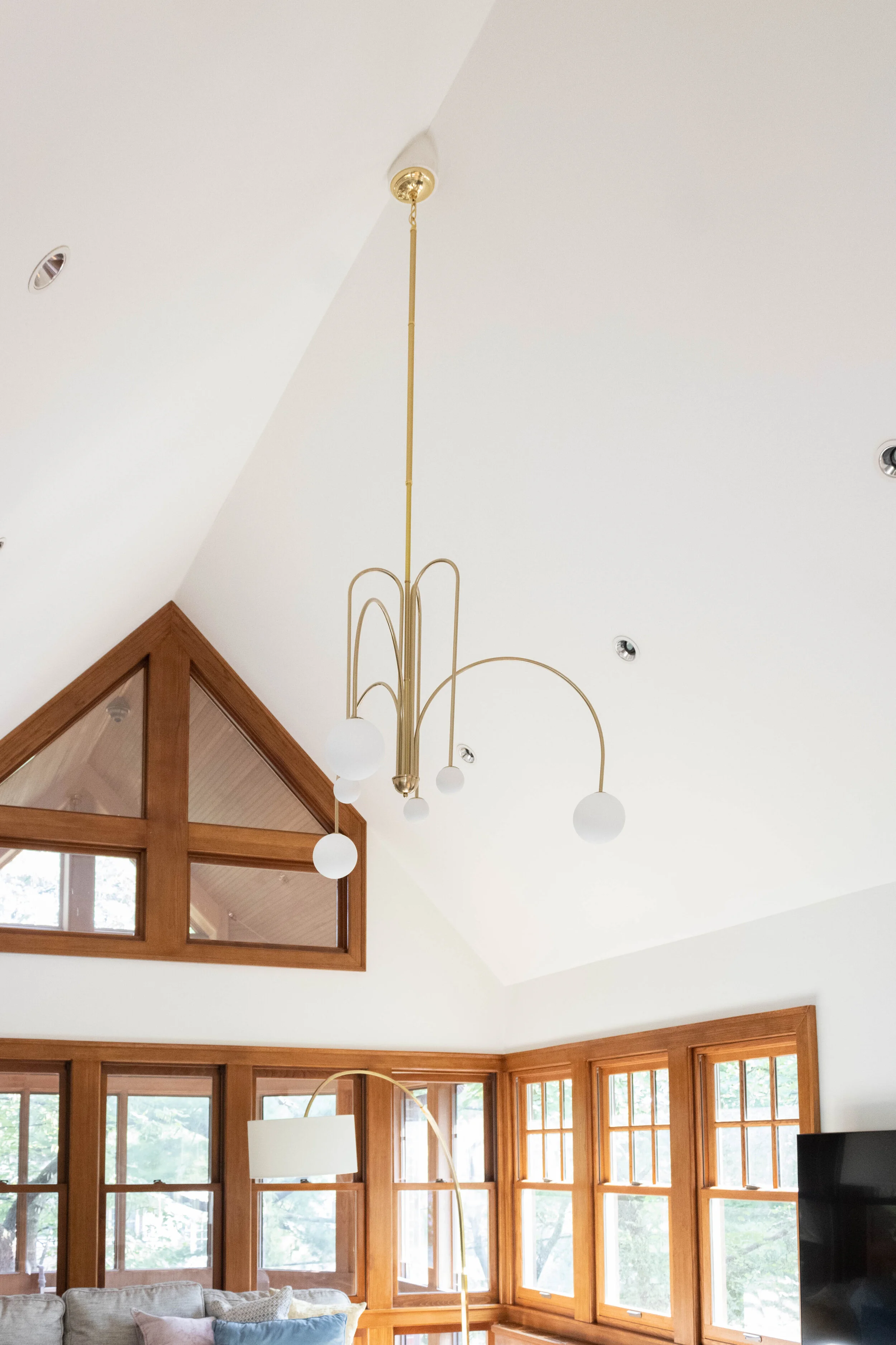 Believe it or not, the island light was not our first choice even though it turned out for the best. The first selection turned out to be a ruse because the rod turned out to be non-adjustable . At first we were totally bummed but then along came the Happy Lights- (like the total cutest ). The Family Room light (noticed similar curves and frosted globes) also presented a challenge. The pitch in the ceiling was very high so it was challenging to find a rod long enough to be able to drop low enough to see from the newly opened kitchen. Fortunately, we were able to hire a woman who was able to rebuild the light to the length needed. Lucky us!