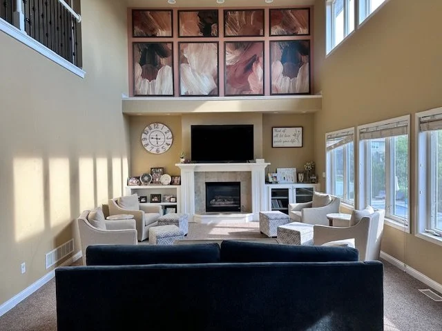 One furnishing client had lived in their home for 12 years and never fully “moved in.” The furniture was mismatched, the walls were bare, and they didn’t know where to begin. We helped transform their living and sitting rooms into spaces that felt current, calm, and tailored—with updated paint, bold soft seating, and even framed wallpaper to warm up their tall ceilings.
