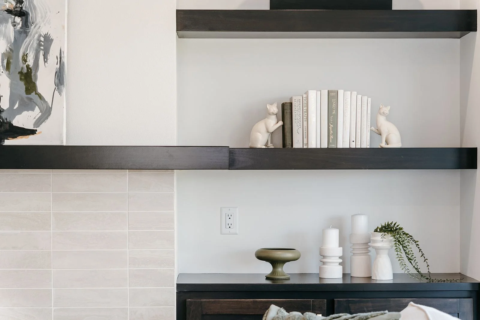 A big part of the fireplace design in this home is the asymmetric layout of the built-ins and open shelving. This adds an interesting contrast with the white stacked tile on the fireplace!