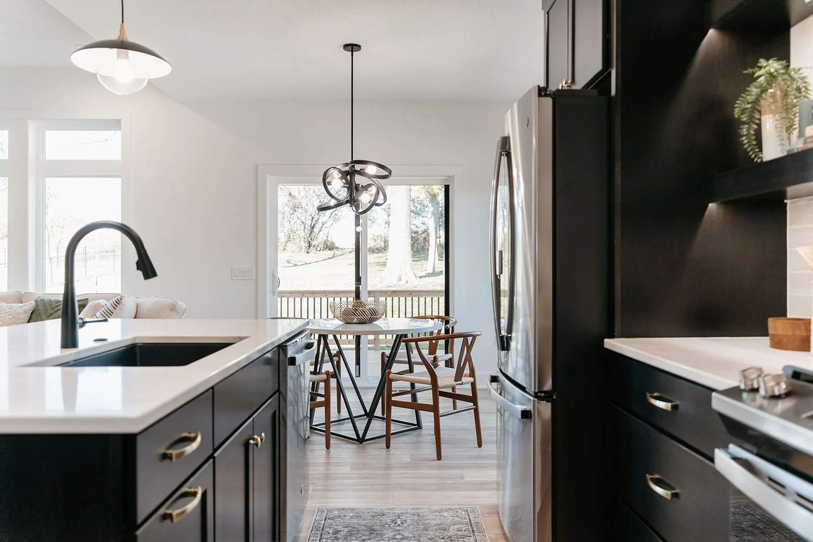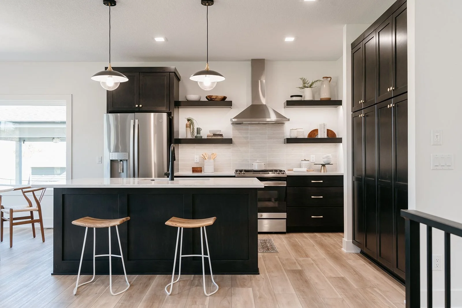 A little about the Wolcott Circle home: We teamed up with Kruse Development Iowa yet again for a new build here in Des Moines. This home shows off elements of a sweet and simple design in black and white. The open concept and neutral colors in this already sold spec home, paired with the beautiful black stain called Dusk, showcase the dramatic design of the built-ins and kitchen cabinets. Check out our photos below for a more in-depth tour of the bold and simple elements within this home!